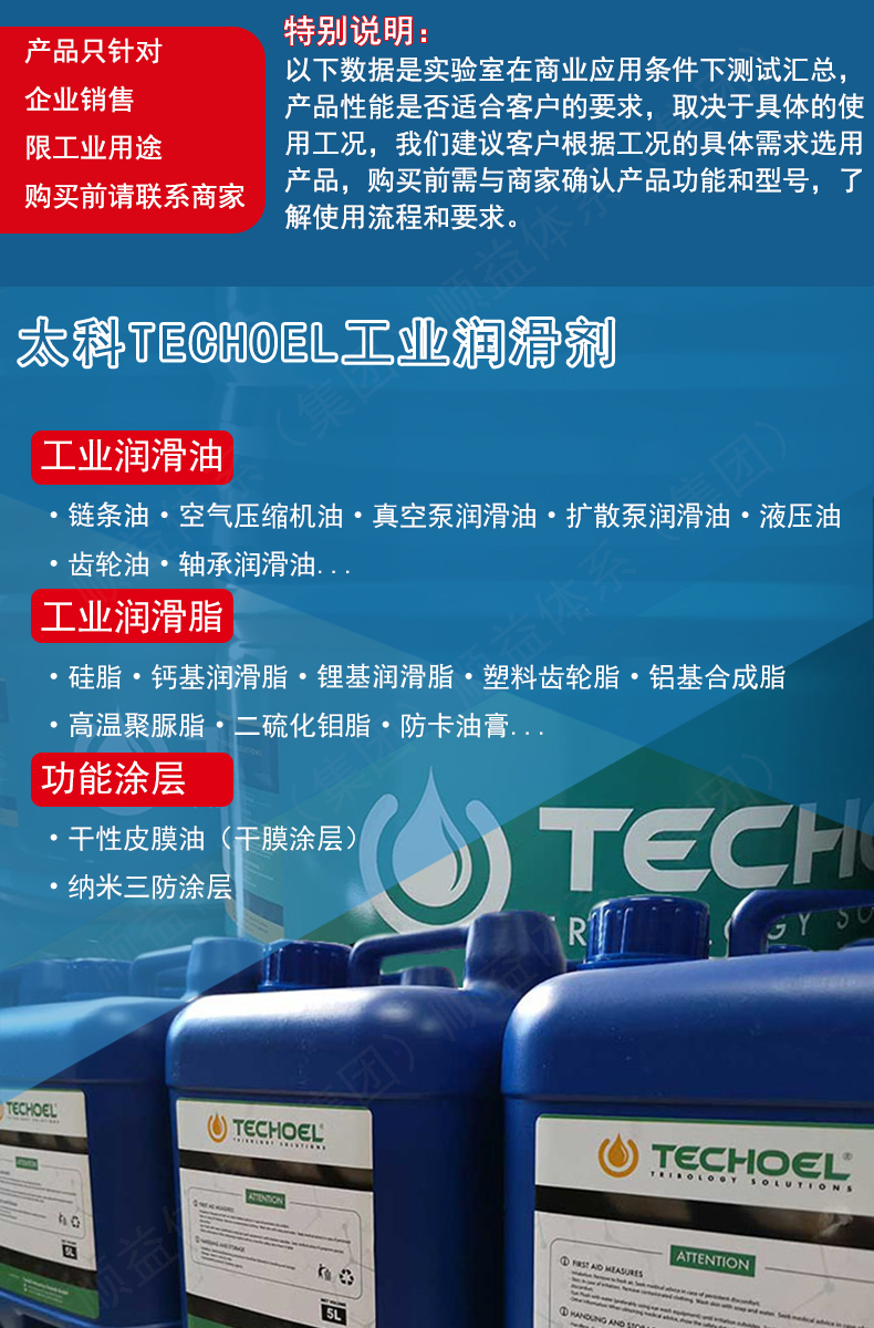 太科TECHOEL是一家工业润滑剂定制开发公司,总部位于德国的斯图加特市,致力于工业合成润滑油、合成润滑脂、特种润滑材料的技术研发。业务全面覆盖汽车、轴承、电子、纺织、电机、轨道交通、风电设备、造纸、食品等行业。顺益体系(集团)作为太科Techoel 授权经销商,与太科Techoel 携手合作致力于为客户提供优质的工业润滑解决方案。