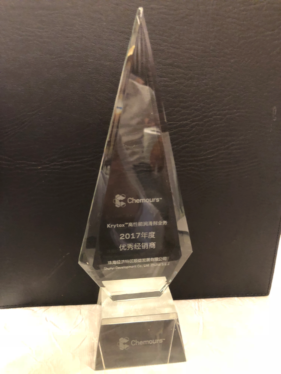 在充满挑战的2017年里,珠海经济特区顺益发展有限公司在Krytox™高性能润滑油业务领域业绩突出业绩表现突出,荣获科慕Chemours 2017年度优秀经销商奖。
