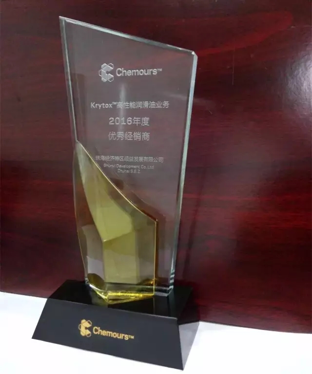2016年顺益体系(集团)在 Krytox™高性能润滑油业务领域业绩突出,荣获2016年度科慕krytox优秀经销商奖。